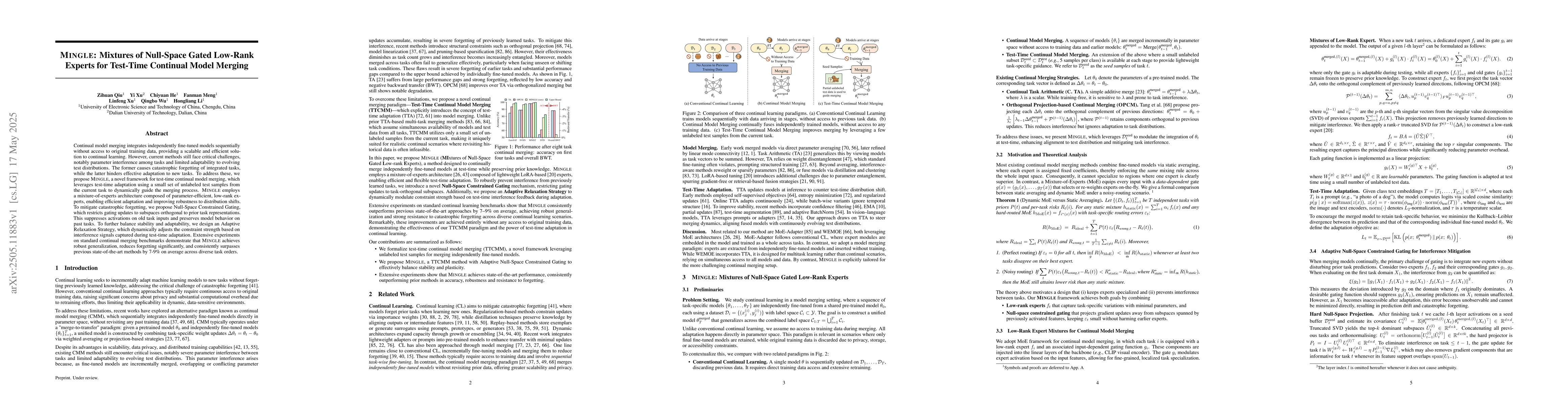 MINGLE introduces a novel framework for test-time continual model merging using mixtures of null-space gated low-rank experts, along with Null-Space Constrained Gating and Adaptive Relaxation Strategy.