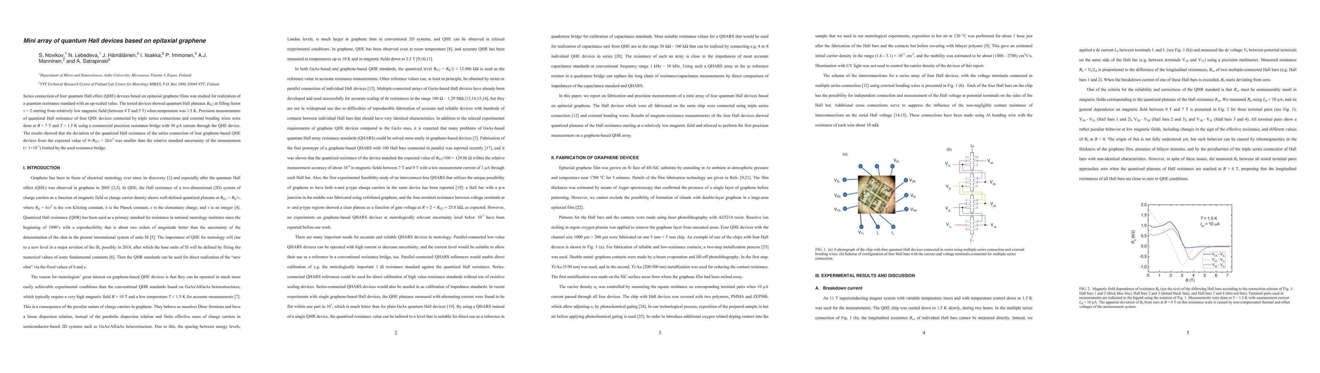 The research explores a series connection of four quantum Hall effect devices based on epitaxial graphene to create a scalable quantum resistance standard, achieving quantized Hall resistance plateaus at low magnetic fields. Precision measurements confirm the devices' high accuracy with deviations less than the measurement's relative standard uncertainty.