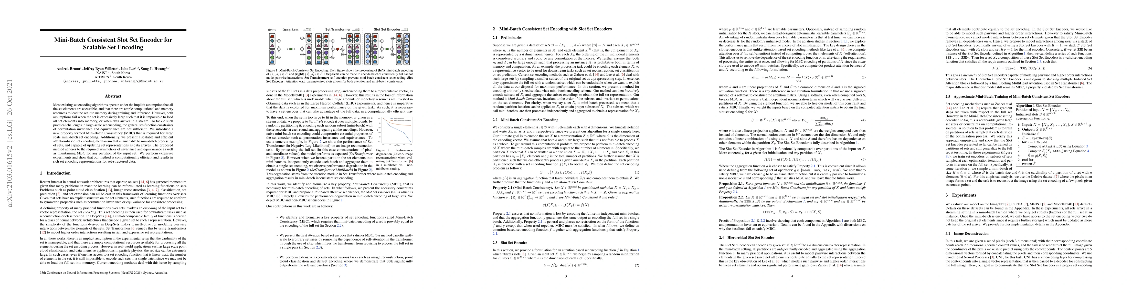 Most existing set encoding algorithms operate under the implicit assumption that all the set elements are accessible, and that there are ample computational and memory resources to load the set into memory during training and inference. However, both assumptions fail when the set is excessively large such that it is impossible to load all set elements into memory, or when data arrives in a stream. To tackle such practical challenges in large-scale set encoding, the general set-function constraints of permutation invariance and equivariance are not sufficient. We introduce a new property termed Mini-Batch Consistency (MBC) that is required for large scale mini-batch set encoding. Additionally, we present a scalable and efficient attention-based set encoding mechanism that is amenable to mini-batch processing of sets, and capable of updating set representations as data arrives. The proposed method adheres to the required symmetries of invariance and equivariance as well as maintaining MBC for any partition of the input set. We perform extensive experiments and show that our method is computationally efficient and results in rich set encoding representations for set-structured data.