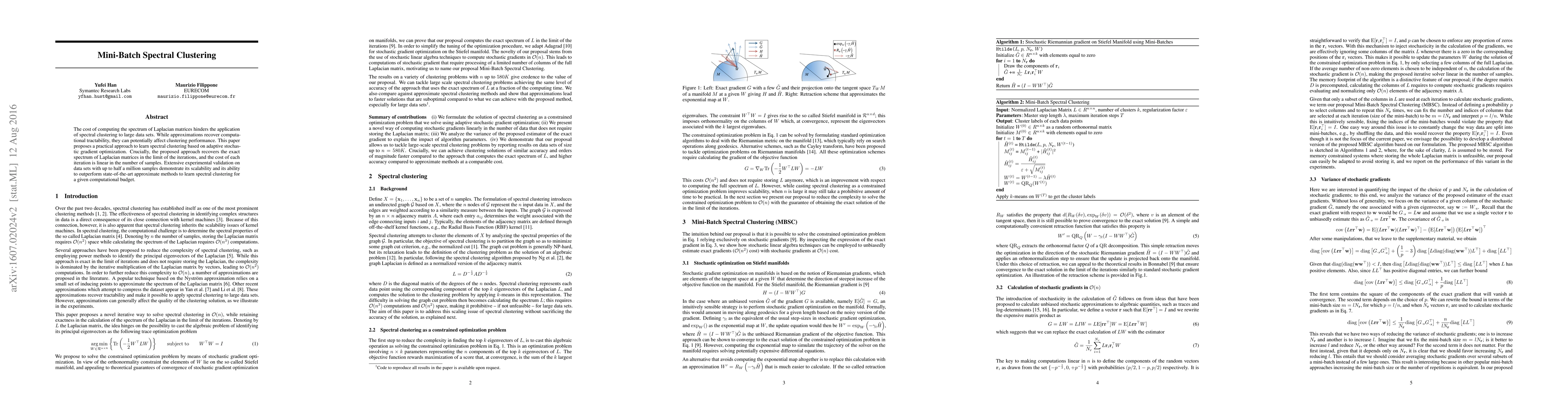 This paper introduces a scalable mini-batch spectral clustering method using adaptive stochastic gradient optimization that approximates the exact spectrum of Laplacian matrices efficiently, outperforming existing approximate methods on large datasets.