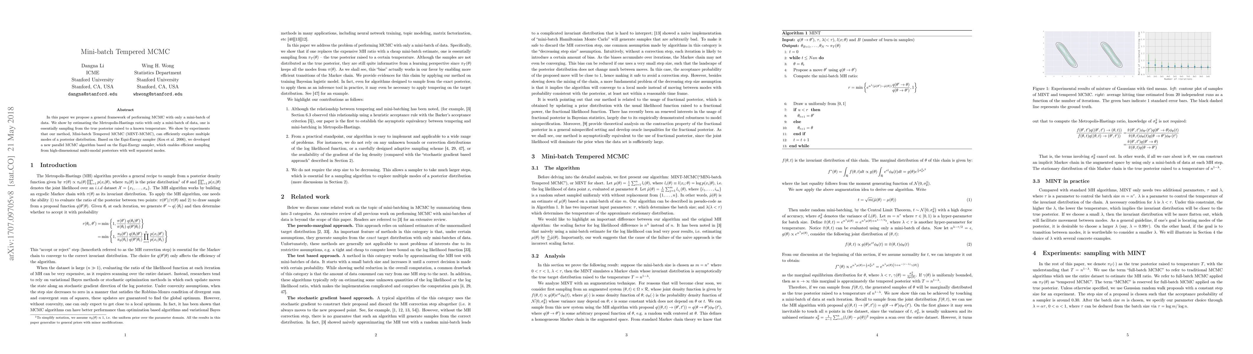 The paper proposes a mini-batch Tempered MCMC (MINT-MCMC) framework for sampling from posterior distributions using mini-batches of data. It extends the Equi-Energy sampler to develop a parallel MCMC algorithm capable of efficiently exploring high-dimensional multi-modal posteriors with well-separated modes.