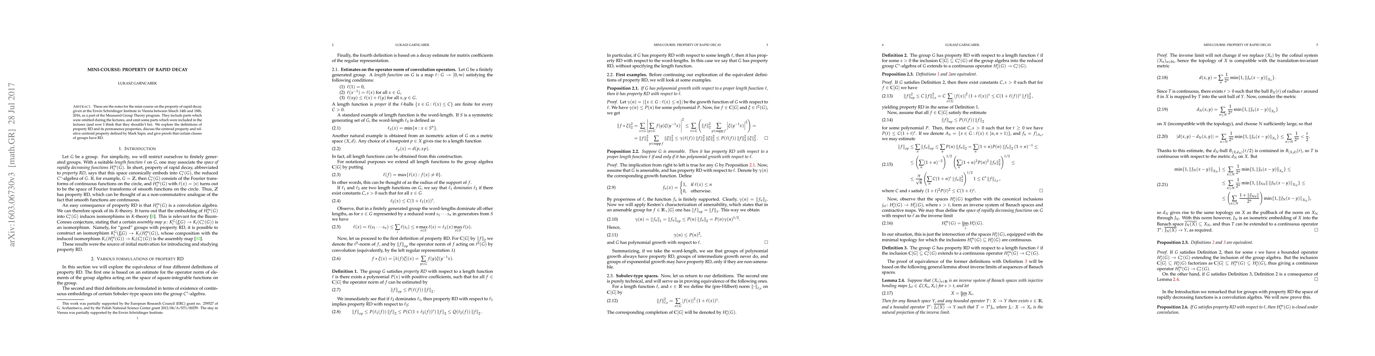 These are the notes for the mini-course on the property of rapid decay given at the Erwin Schr\"odinger Institute in Vienna between March 14th and 18th, 2016, as a part of the Measured Group Theory program. They include parts which were omitted during the lectures, and omit some parts which were included in the lectures (and now I think that they shouldn't have been). We explore the definitions of property RD and its permanence properties, discuss the centroid property and relative centroid property defined by Mark Sapir, and give proofs that certain classes of groups have RD.