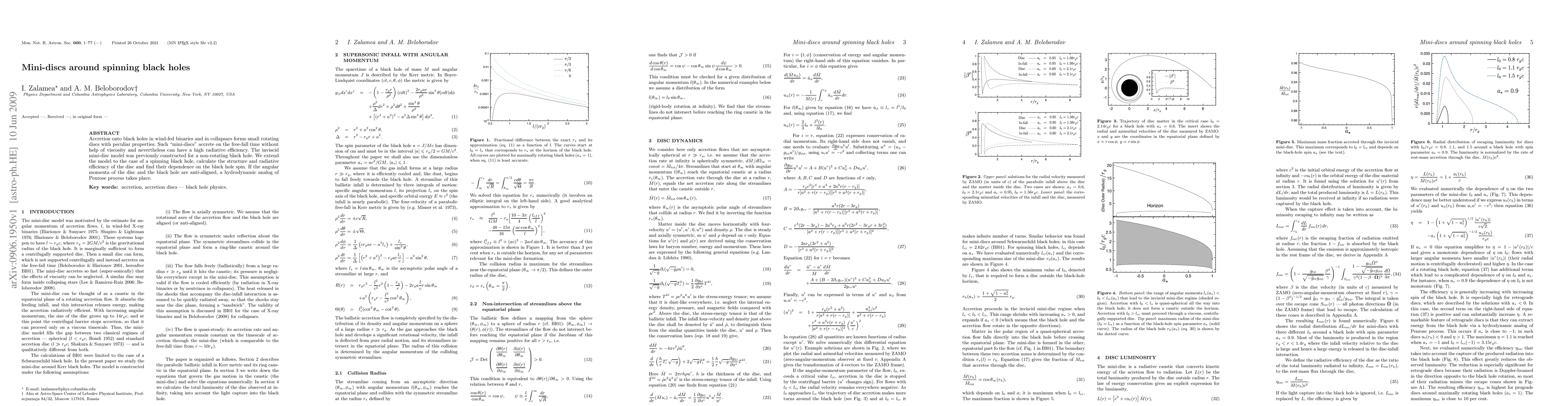 This paper extends the inviscid mini-disc model to spinning black holes, analyzing their structure and radiative efficiency. It finds that anti-aligned angular momenta between the disc and black hole can lead to a hydrodynamic Penrose process.