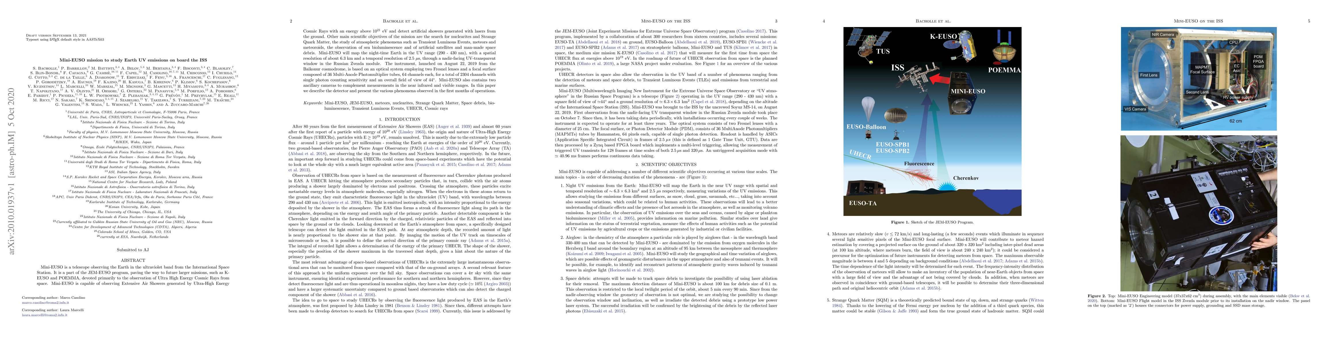 Mini-EUSO is a telescope on the ISS observing Earth's ultraviolet emissions to study Ultra High Energy Cosmic Rays and other phenomena. It features a high-resolution UV detector and has observed various atmospheric and man-made events since its launch in 2019.