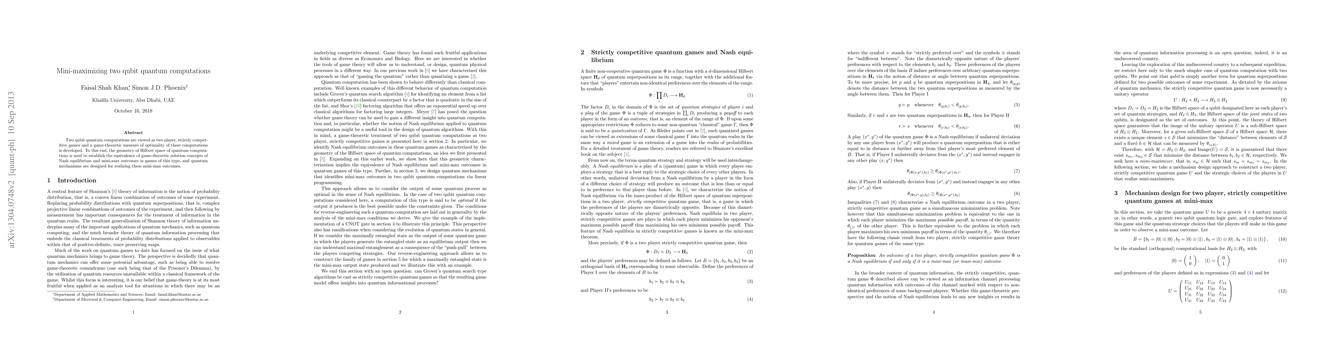 This research introduces a game-theoretic approach to optimize two-qubit quantum computations, equating Nash equilibrium with mini-max outcomes. It also presents quantum mechanisms to achieve these optimal results.