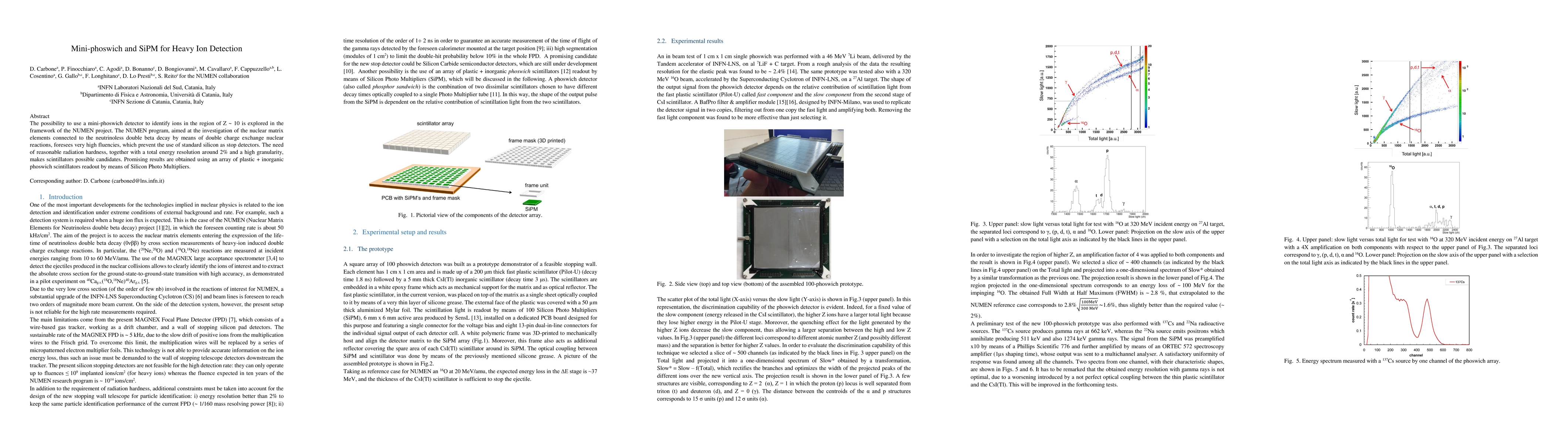 Researchers explored using mini-phoswich detectors to identify ions in heavy ion collisions, achieving promising results with plastic + inorganic phoswich scintillators readout by Silicon Photo Multipliers.