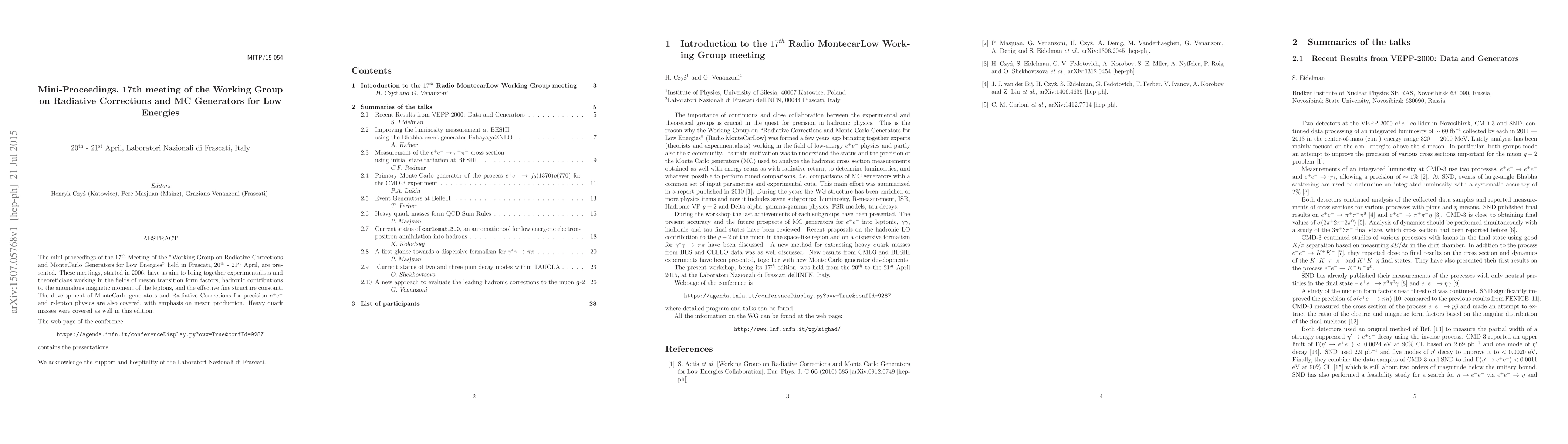 The 17th Working Group Meeting on Radiative Corrections and MC Generators for Low Energies in Frascati, April 20-21, brought together experts to discuss advancements in meson transition form factors, lepton anomalous magnetic moments, effective fine structure constant, and precision e+e- and tau-lepton physics. Heavy quark masses were also addressed.