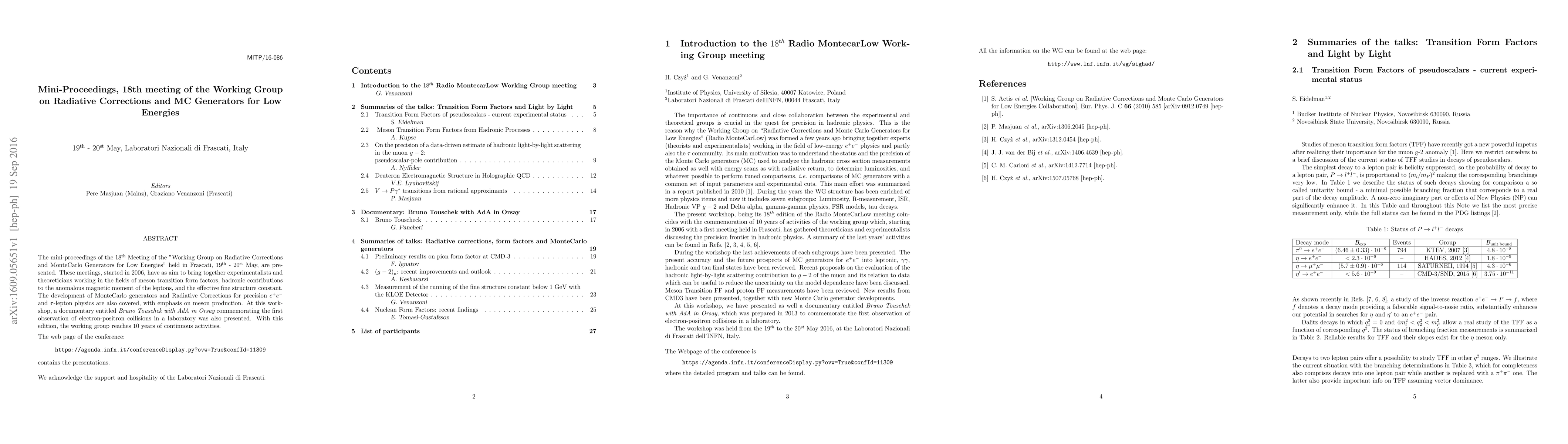 The mini-proceedings of the 18$^{\mathrm{th}}$ Meeting of the "Working Group on Radiative Corrections and MonteCarlo Generators for Low Energies" held in Frascati, 19$^{\mathrm{th}}$ - 20$^{\mathrm{st}}$ May, are presented. These meetings, started in 2006, have as aim to bring together experimentalists and theoreticians working in the fields of meson transition form factors, hadronic contributions to the anomalous magnetic moment of the leptons, and the effective fine structure constant. The development of MonteCarlo generators and Radiative Corrections for precision $e^+e^-$ and $\tau$-lepton physics are also covered, with emphasis on meson production. At this workshop, a documentary entitled {\it Bruno Touschek with AdA in Orsay} commemorating the first observation of electron-positron collisions in a laboratory was also presented. With this edition, the working group reaches 10 years of continuous activities.