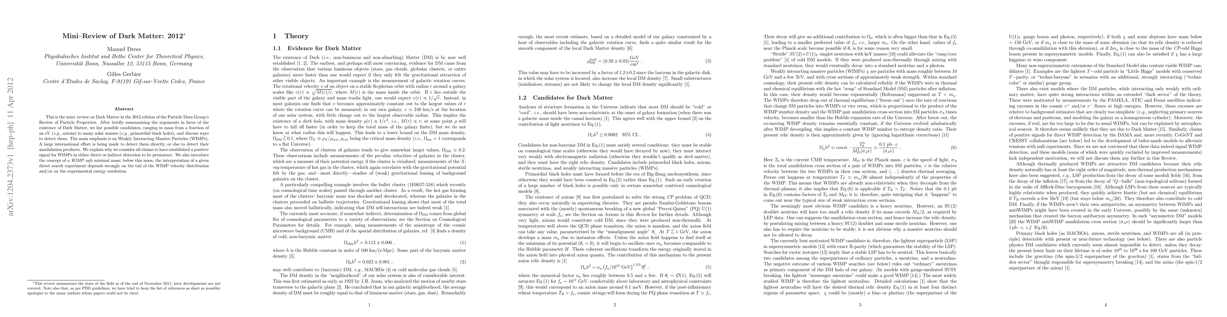 This is the mini-review on Dark Matter in the 2012 edition of the Particle Data Group's Review of Particle Properties. After briefly summarizing the arguments in favor of the existence of Dark Matter, we list possible candidates, ranging in mass from a fraction of an eV (e.g., axions) to many solar masses (e.g., primordial black holes), and discuss ways to detect them. The main emphasis is on Weakly Interacting Massive Particles (WIMPs). A large international effort is being made to detect them directly, or else to detect their annihilation products. We explain why we consider all claims to have established a positive signal for WIMPs in either direct or indirect detection to be premature. We also introduce the concept of a {\it WIMP safe} minimal mass; below this mass, the interpretation of a given direct search experiment depends strongly on the tail of the WIMP velocity distribution and/or on the experimental energy resolution.