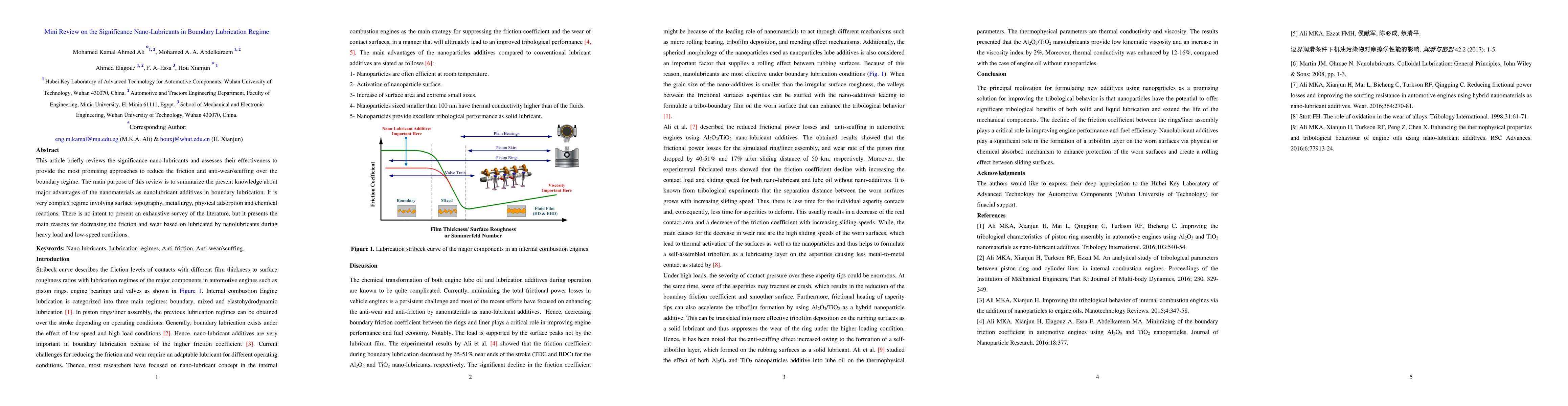 This review assesses the effectiveness of nano-lubricants in reducing friction and wear during boundary lubrication, a complex regime involving surface topography and chemical reactions. It highlights the main advantages of using nanomaterials as additives to decrease friction and wear under heavy load and low-speed conditions.