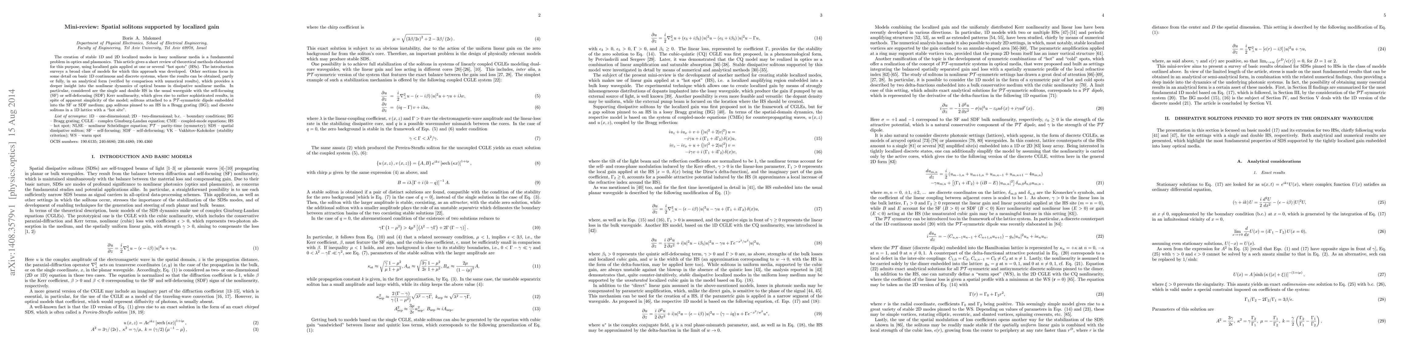 This mini-review explores theoretical methods for creating stable 1D and 2D spatial solitons in lossy nonlinear media using localized gain at "hot spots." It provides analytical insights into the nonlinear dynamics of optical beams, focusing on various models including waveguides with self-focusing and self-defocusing Kerr nonlinearity, PT-symmetric dipoles, Bragg gratings, and 1D lattices.