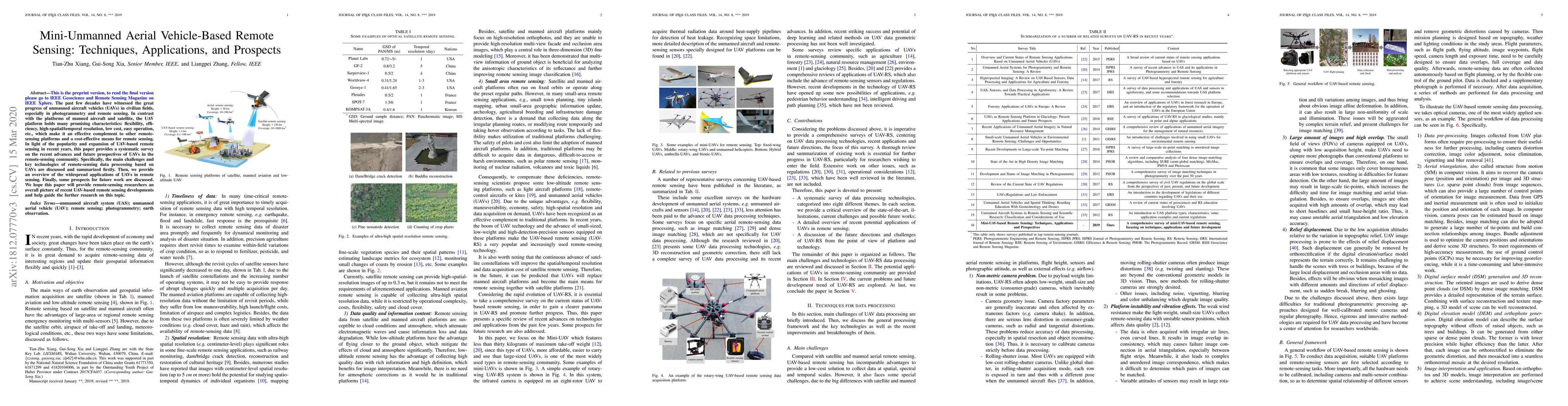 This paper reviews the advancements and future prospects of mini-unmanned aerial vehicles (UAVs) in remote sensing, highlighting their advantages over manned aircraft and satellites. It discusses challenges in data processing and provides an overview of UAV applications, aiming to guide future research in this field.