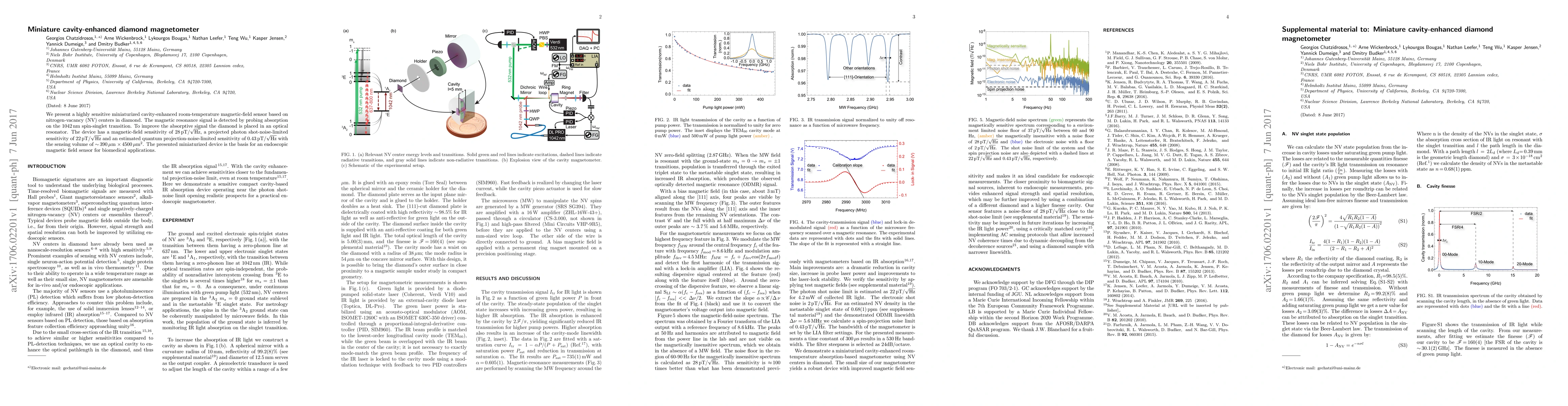 We present a highly sensitive miniaturized cavity-enhanced room-temperature magnetic-field sensor based on nitrogen-vacancy (NV) centers in diamond. The magnetic resonance signal is detected by probing absorption on the 1042\,nm spin-singlet transition. To improve the absorptive signal the diamond is placed in an optical resonator. The device has a magnetic-field sensitivity of 28 pT/$\sqrt{\rm{Hz}}$, a projected photon shot-noise-limited sensitivity of 22 pT/$\sqrt{\rm{Hz}}$ and an estimated quantum projection-noise-limited sensitivity of 0.43 pT/$\sqrt{\rm{Hz}}$ with the sensing volume of $\sim$ 390 $\mu$m $\times$ 4500 $\mu$m$^{2}$. The presented miniaturized device is the basis for an endoscopic magnetic field sensor for biomedical applications.