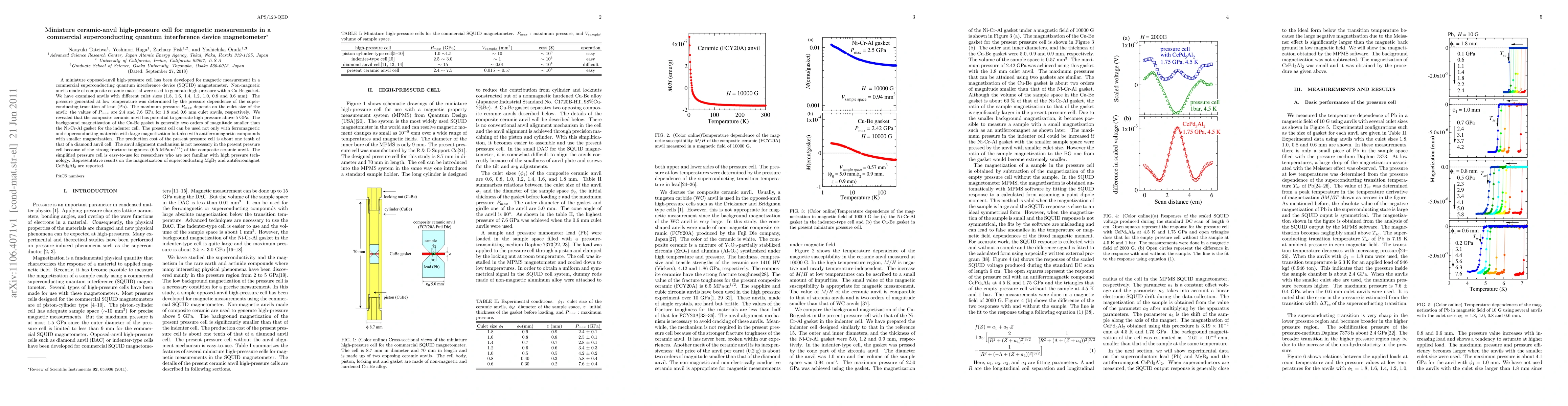 This paper presents a miniature ceramic-anvil high-pressure cell for magnetic measurements in a commercial SQUID magnetometer, demonstrating its use with both ferromagnetic and antiferromagnetic materials. The cell can generate pressures up to 7.6 GPa, with a cost about one-tenth of a diamond anvil cell, and shows promising results for materials like MgB$_2$ and CePd$_5$Al$_2$.