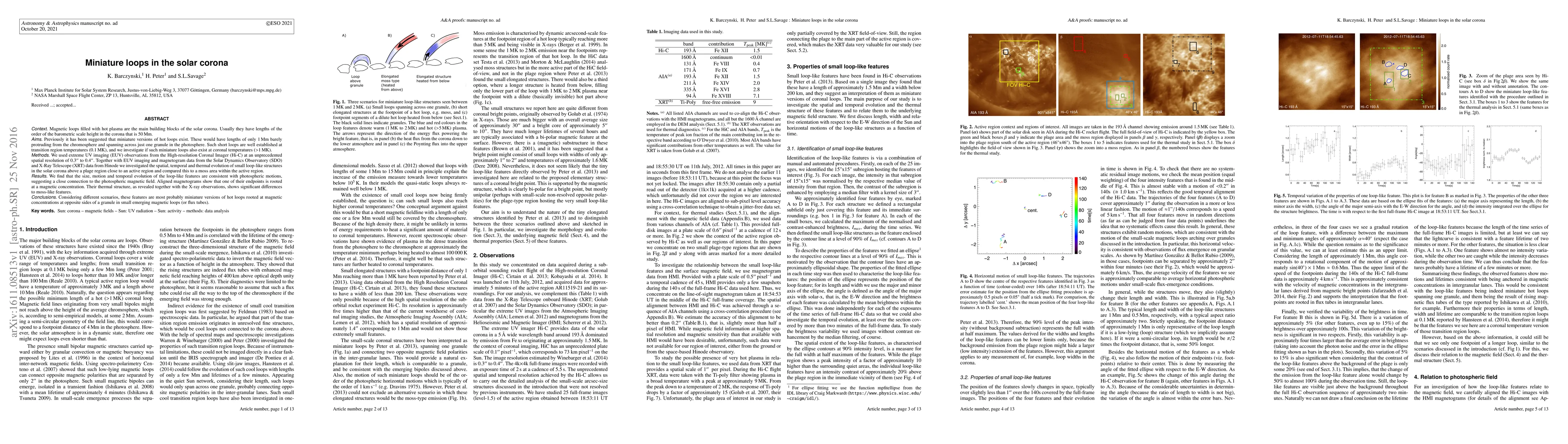 The research utilized extreme UV imaging (EUV) observations from the High-resolution Coronal Imager (Hi-C) at unprecedented spatial resolution, along with EUV imaging and magnetogram data from the Solar Dynamics Observatory (SDO) and X-Ray Telescope (XRT) data from Hinode to investigate small loop-like structures in the solar corona.