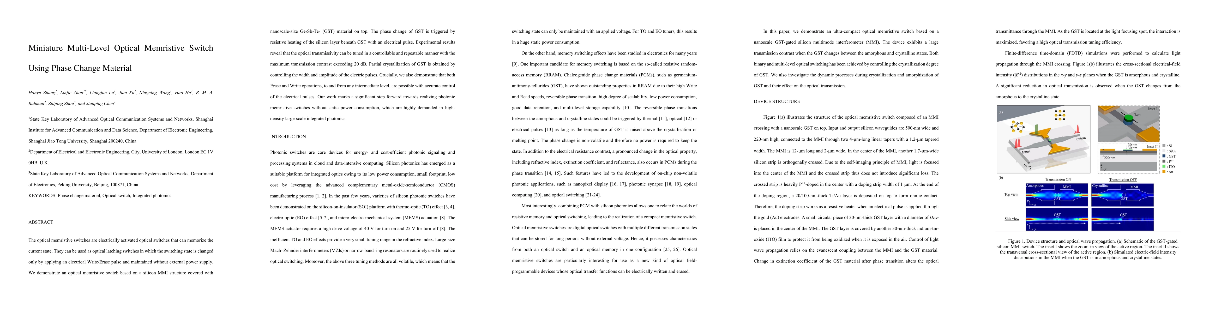 This paper presents a miniature optical memristive switch utilizing phase change material Ge2Sb2Te5 (GST) on a silicon MMI structure, enabling controllable and repeatable optical transmissivity tuning with minimal power consumption. The study demonstrates precise control over Write and Erase operations to intermediate levels, advancing photonic memory technology.