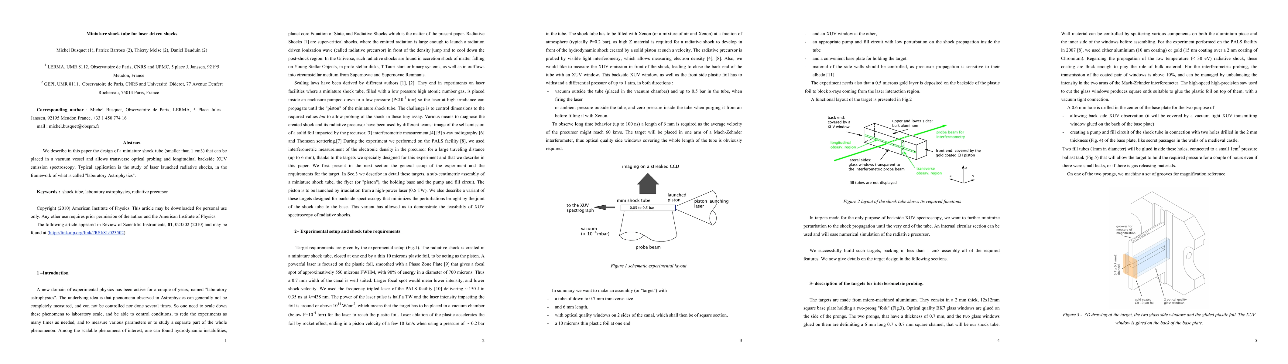 We describe in this paper the design of a miniature shock tube (smaller than 1 cm3) that can be placed in a vacuum vessel and allows transverse optical probing and longitudinal backside XUV emission spectroscopy. Typical application is the study of laser launched radiative shocks, in the framework of what is called "laboratory Astrophysics".