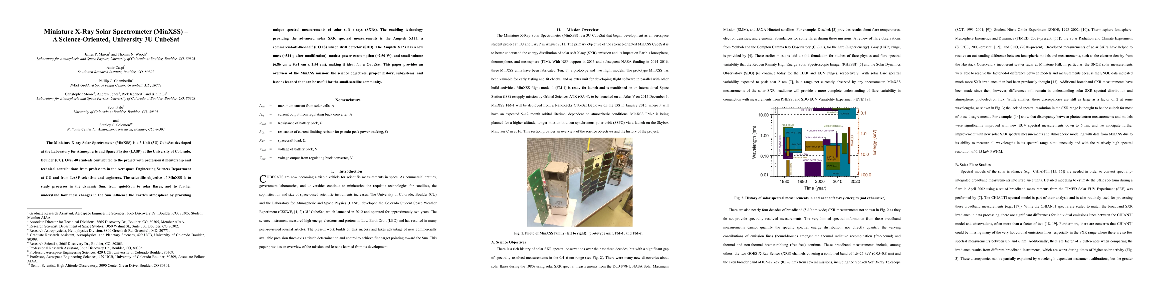 The MinXSS CubeSat, developed by the University of Colorado Boulder, aims to study solar processes and their effects on Earth's atmosphere through spectral measurements of solar soft x-rays. The project involved over 40 students and utilized advanced silicon drift detector technology for efficient data collection.