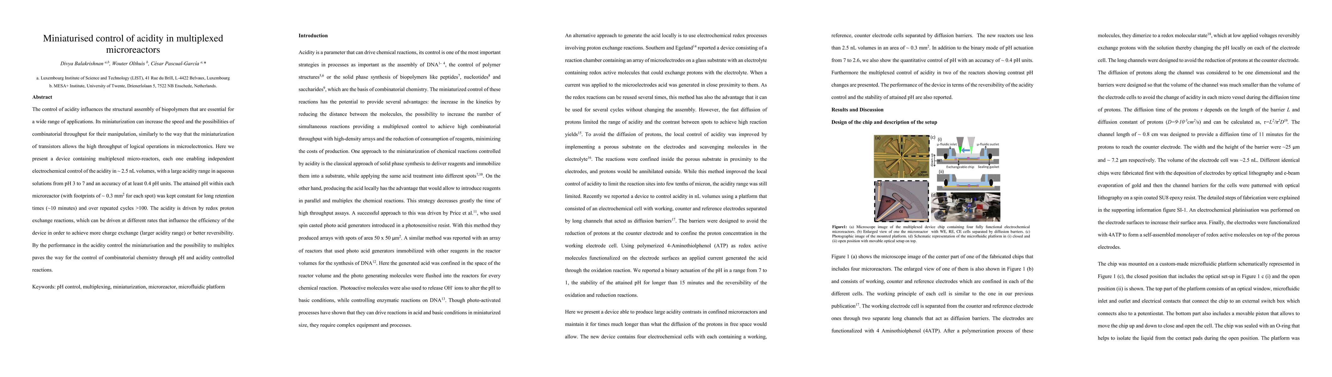 This paper introduces a device for miniaturized, multiplexed control of acidity in microreactors, enabling independent electrochemical regulation of pH in volumes as small as 2.5 nL with high accuracy and stability. The device's potential for combinatorial chemistry applications is highlighted by its ability to maintain constant pH over long periods and multiple cycles.