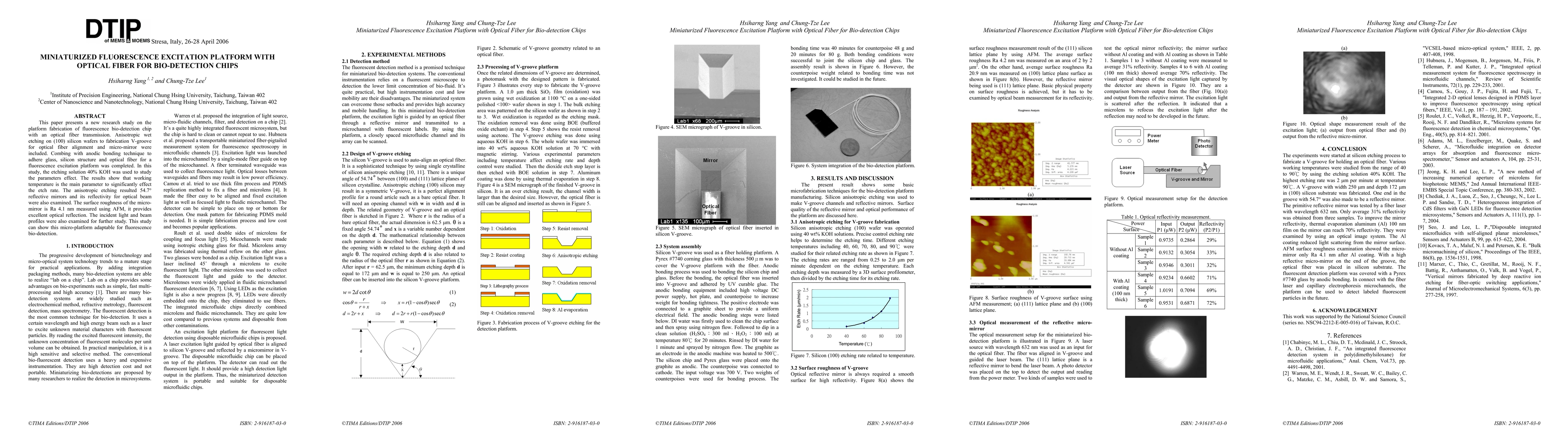 This paper details the fabrication of a miniaturized fluorescence excitation platform using anisotropic wet etching and optical fiber alignment, showing that temperature significantly affects the etch rate. The platform features reflective V-grooves and micro-mirrors with excellent optical properties, making it suitable for fluorescence bio-detection.