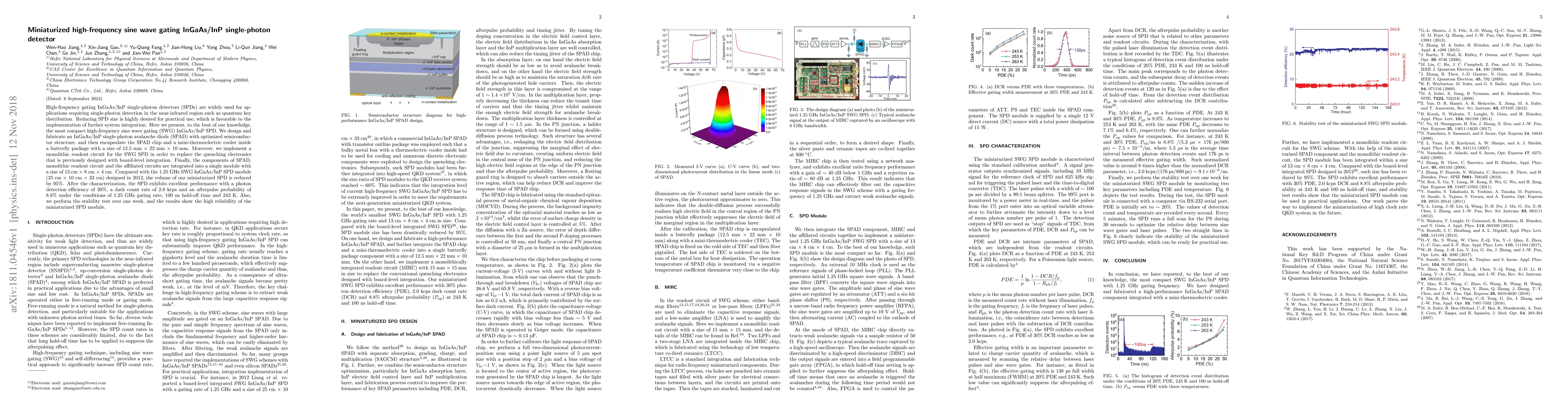High-frequency gating InGaAs/InP single-photon detectors (SPDs) are widely used for applications requiring single-photon detection in the near-infrared region such as quantum key distribution. Reducing SPD size is highly desired for practical use, which is favorable to the implementation of further system integration. Here we present, to the best of our knowledge, the most compact high-frequency sine wave gating (SWG) InGaAs/InP SPD. We design and fabricate an InGaAs/InP single-photon avalanche diode (SPAD) with optimized semiconductor structure, and then encapsulate the SPAD chip and a mini-thermoelectric cooler inside a butterfly package with a size of 12.5 mm $\times$ 22 mm $\times$ 10 mm. Moreover, we implement a monolithic readout circuit for the SWG SPD in order to replace the quenching electronics that is previously designed with board-level integration. Finally, the components of SPAD, monolithic readout circuit and the affiliated circuits are integrated into a single module with a size of 13 cm $\times$ 8 cm $\times$ 4 cm. Compared with the 1.25 GHz SWG InGaAs/InP SPD module (25 cm $\times$ 10 cm $\times$ 33 cm) designed in 2012, the volume of our miniaturized SPD is reduced by 95\%. After the characterization, the SPD exhibits excellent performance with a photon detection efficiency of 30\%, a dark count rate of 2.0 kcps and an afterpulse probability of 8.8\% under the conditions of 1.25 GHz gating rate, 100 ns hold-off time and 243 K. Also, we perform the stability test over one week, and the results show the high reliability of the miniaturized SPD module.