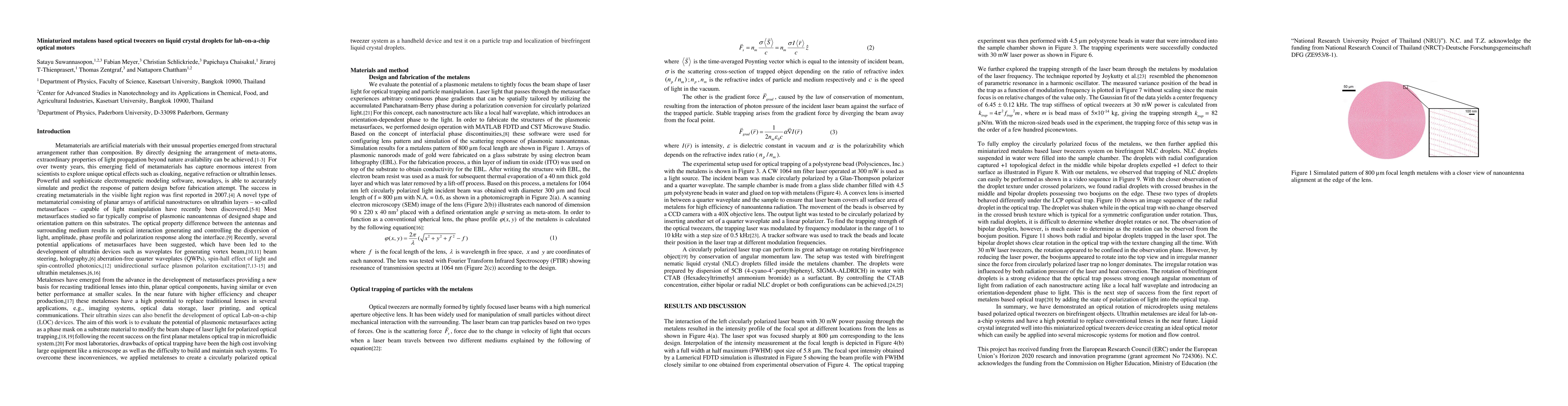 This paper presents a miniaturized metalens-based optical tweezers system using plasmonic gold nanorods to create a high-intensity focal spot, enabling the rotation of birefringent liquid crystal droplets. The metalens, fabricated via electron beam lithography, demonstrates potential for lab-on-a-chip optical motors.