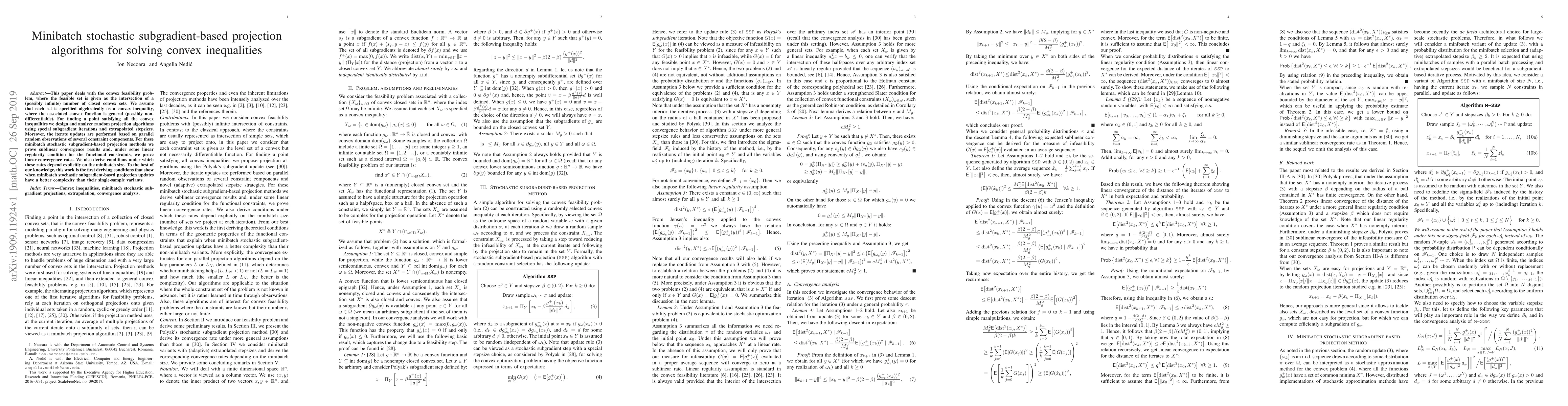 This paper proposes minibatch stochastic subgradient-based projection algorithms for solving convex feasibility problems, proving sublinear and linear convergence rates under certain conditions, and demonstrating improved complexity compared to single-sample variants.