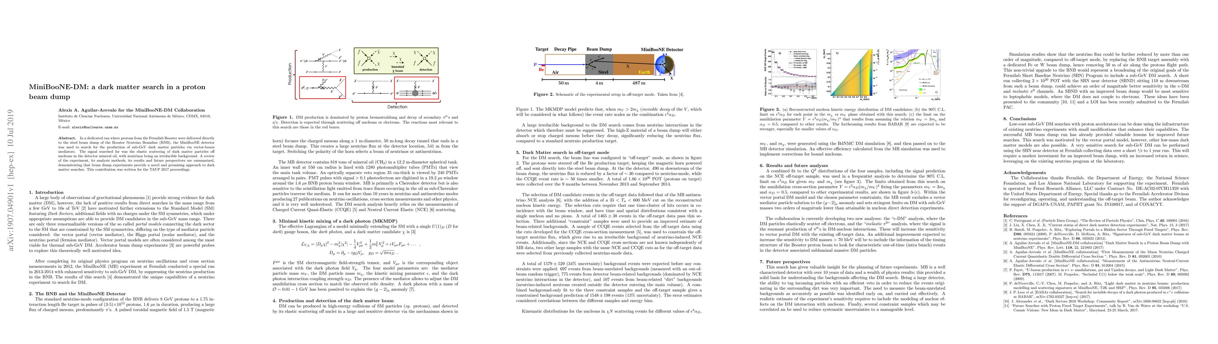 The MiniBooNE-DM experiment utilized a proton beam dump to search for sub-GeV dark matter particles via vector-boson mediators, focusing on elastic scattering events in mineral oil. Despite neutrino background challenges, the study highlights the potential of beam dump experiments for dark matter detection.