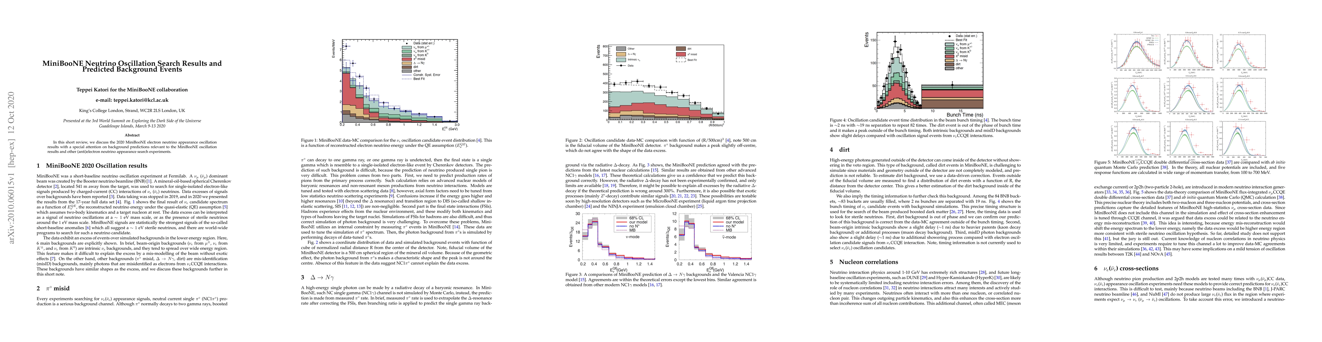 Summary: This review presents the 2020 MiniBooNE findings on electron neutrino appearance oscillations, emphasizing the background event predictions crucial for interpreting these results and those from other (anti)electron neutrino appearance experiments.