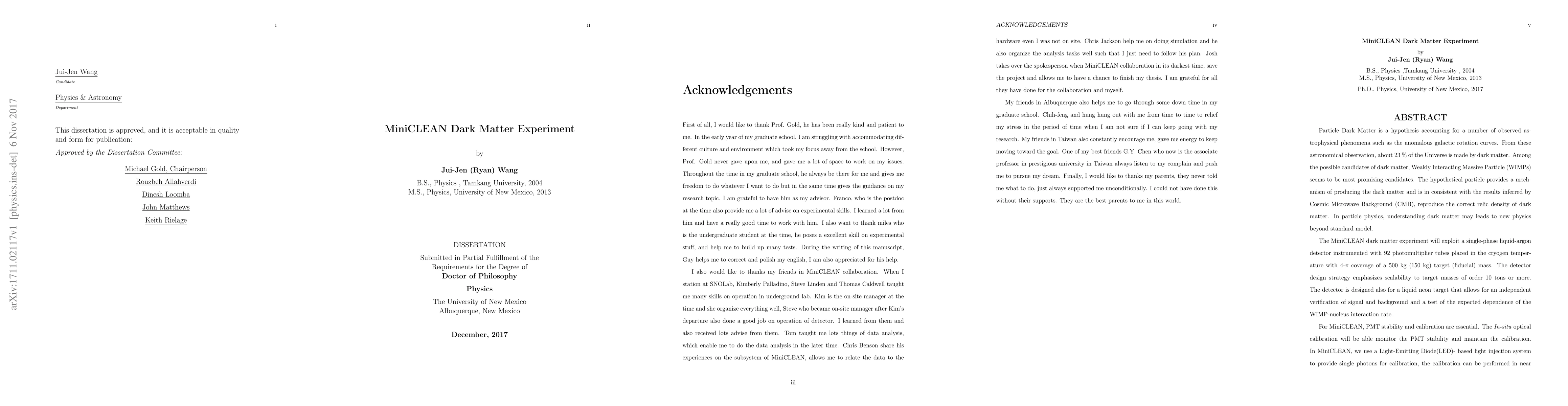 The MiniCLEAN dark matter experiment utilizes a single-phase liquid-argon detector with 92 photomultiplier tubes to search for WIMPs, emphasizing scalability to larger target masses. The experiment employs in-situ optical calibration and a purification system to achieve high detector purity, with preliminary results showing promising performance in pulse shape discrimination and reduced neutron backgrounds.