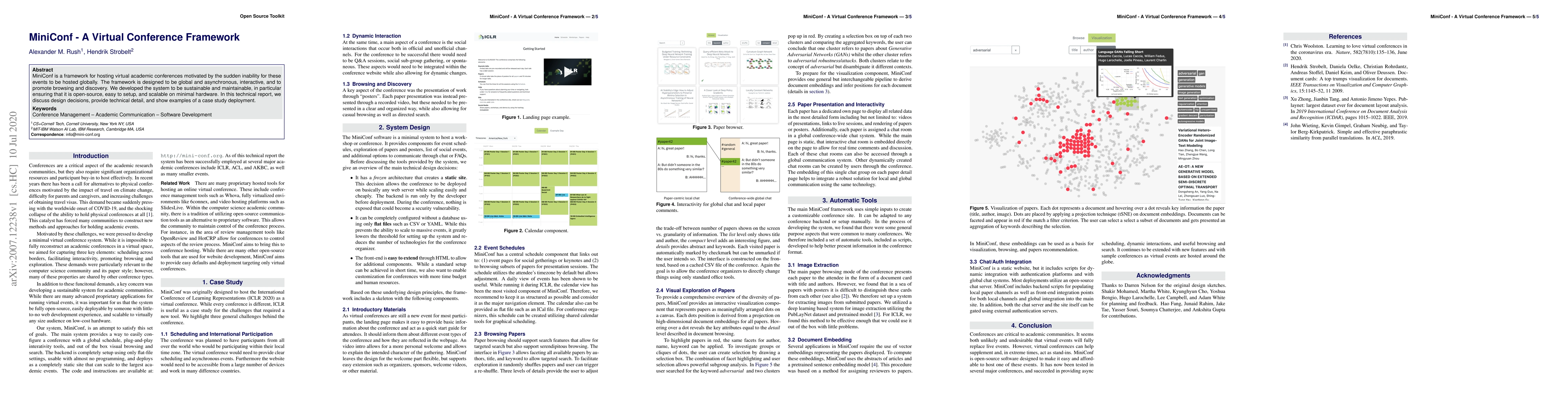 MiniConf is a framework for hosting virtual academic conferences motivated by the sudden inability for these events to be hosted globally. The framework is designed to be global and asynchronous, interactive, and to promote browsing and discovery. We developed the system to be sustainable and maintainable, in particular ensuring that it is open-source, easy to setup, and scalable on minimal hardware. In this technical report, we discuss design decisions, provide technical detail, and show examples of a case study deployment.