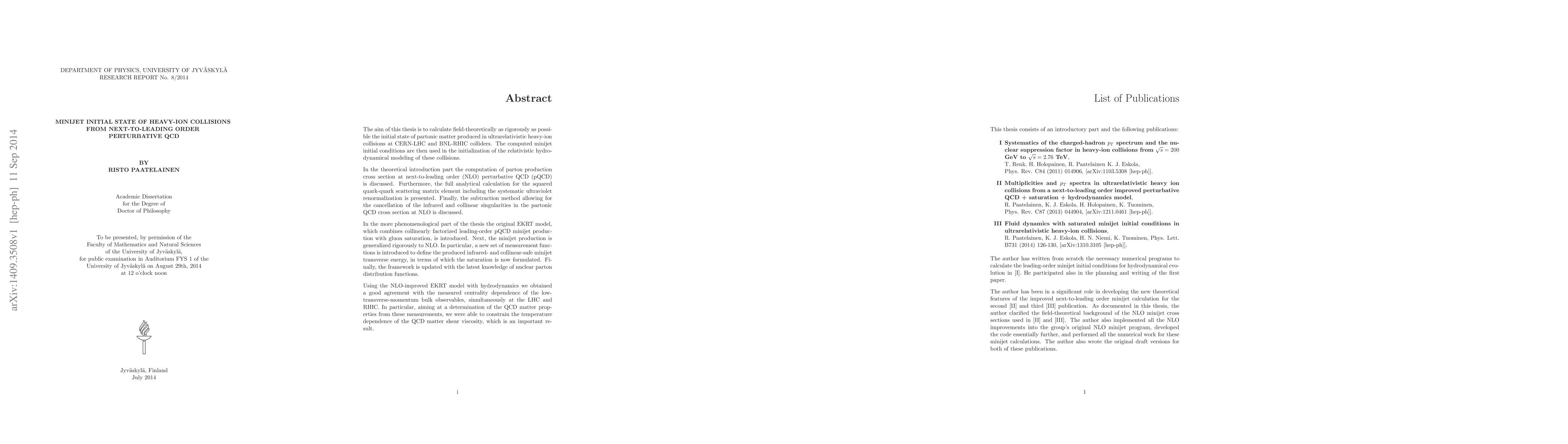 The aim of this thesis is to calculate field-theoretically as rigorously as possible the initial state of partonic matter produced in ultrarelativistic heavy-ion collisions at CERN-LHC and BNL-RHIC colliders. The computed minijet initial conditions are then used in the initialization of the relativistic hydrodynamical modeling of these collisions. In the theoretical introduction part the computation of parton production cross section at next-to-leading order (NLO) perturbative QCD (pQCD) is discussed. Furthermore, the full analytical calculation for the squared quark-quark scattering matrix element including the systematic ultraviolet renormalization is presented. Finally, the subtraction method allowing for the cancellation of the infrared and collinear singularities in the partonic QCD cross section at NLO is discussed. In the more phenomenological part of the thesis the original EKRT model, which combines collinearly factorized leading-order pQCD minijet production with gluon saturation, is introduced. Next, the minijet production is generalized rigorously to NLO. In particular, a new set of measurement functions is introduced to define the produced infrared- and collinear-safe minijet transverse energy, in terms of which the saturation is now formulated. Finally, the framework is updated with the latest knowledge of nuclear parton distribution functions. Using the NLO-improved EKRT model with hydrodynamics we obtained a good agreement with the measured centrality dependence of the low-transverse-momentum bulk observables, simultaneously at the LHC and RHIC. In particular, aiming at a determination of the QCD matter properties from these measurements, we were able to constrain the temperature dependence of the QCD matter shear viscosity, which is an important result.