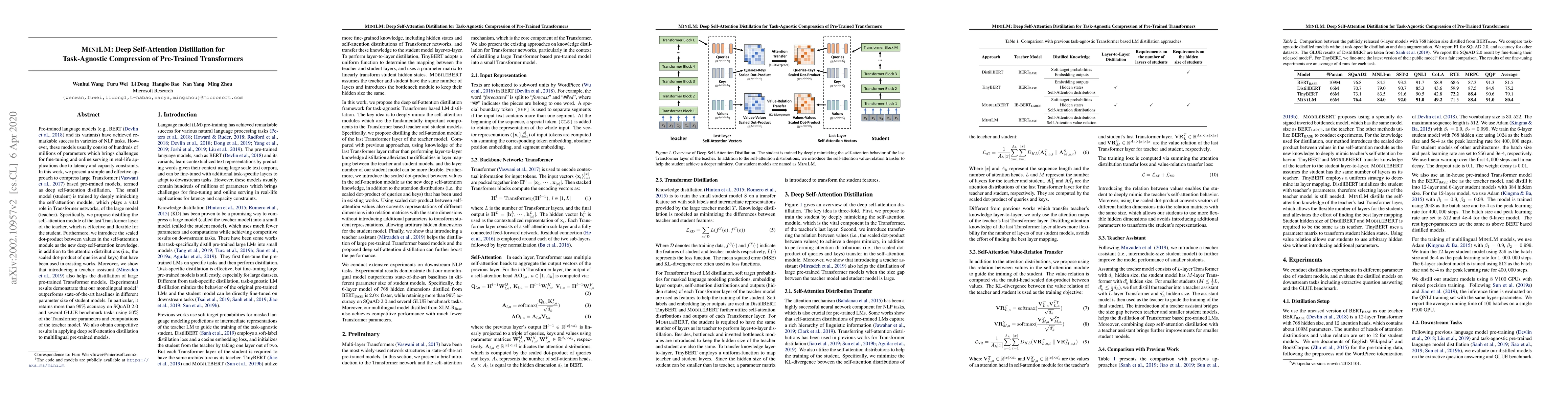 This paper proposes a method called deep self-attention distillation to compress large pre-trained Transformer models, achieving significant reduction in size while retaining high accuracy. The approach involves training a smaller "student" model to mimic the self-attention mechanism of the larger "teacher" model, achieving over 99% accuracy on benchmark tasks using half the parameters and computations.