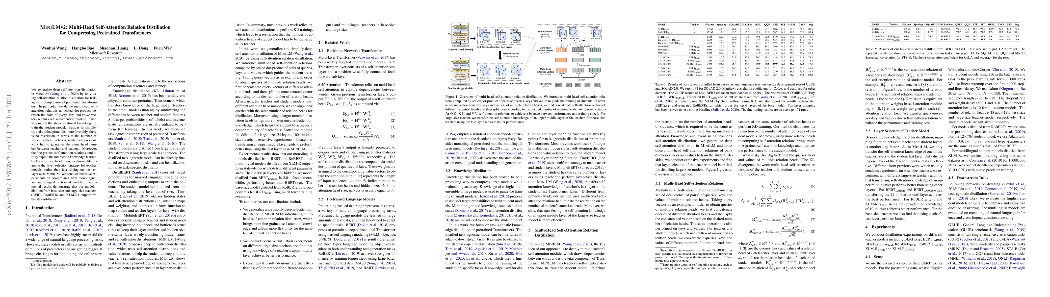 MiniLMv2 employs self-attention relation distillation to compress pretrained Transformers without requiring the same number of attention heads in the student model, achieving better performance than state-of-the-art methods in various experiments. The method leverages fine-grained relational knowledge from the teacher model and explores layer selection strategies beyond just the last layer.