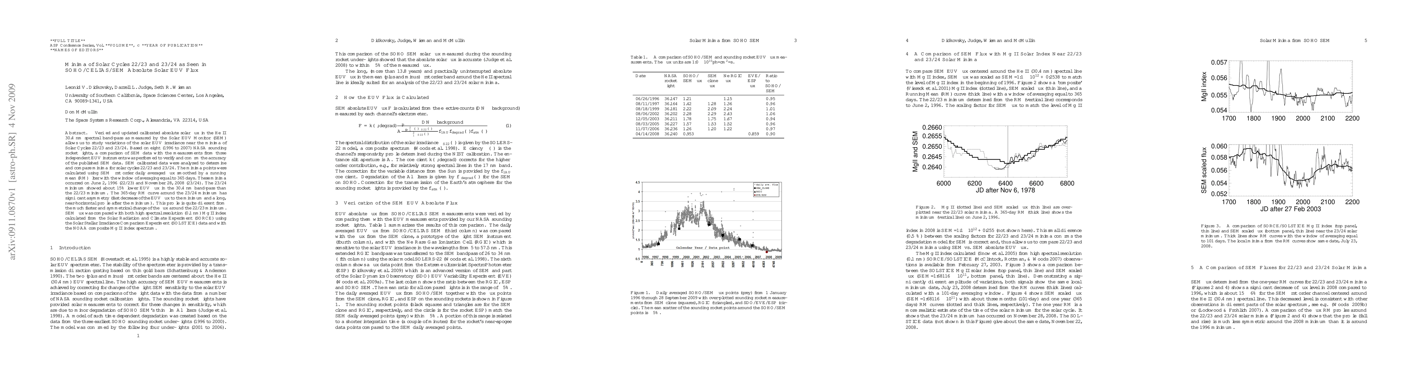 This paper analyzes the absolute solar EUV flux near the minima of Solar Cycles 22/23 and 23/24 using calibrated data from the Solar EUV Monitor (SEM) and confirms its accuracy through comparison with other instruments. The 23/24 minimum showed a 15% lower EUV flux than the 22/23 minimum, with notable asymmetry in the 365-day running mean curve around the 23/24 minimum.