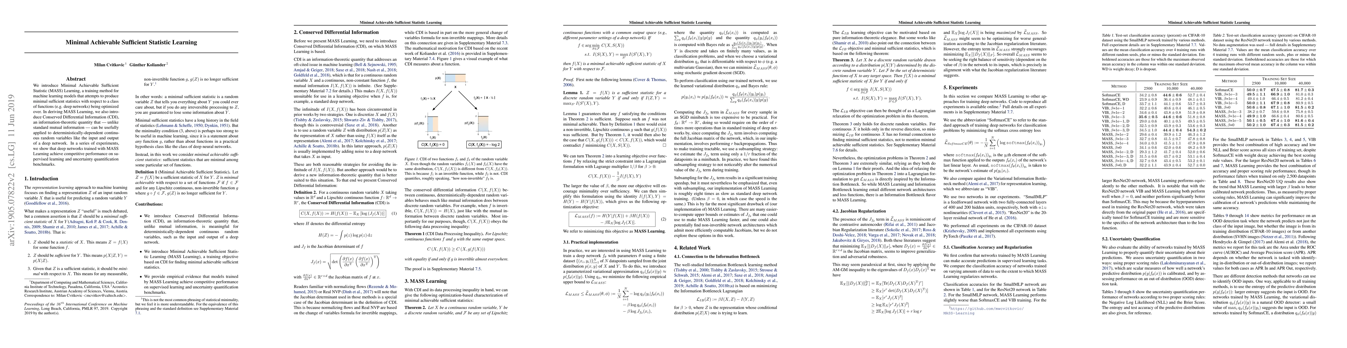 This paper proposes Minimal Achievable Sufficient Statistic (MASS) Learning, a novel training method for machine learning models that aims to generate minimal sufficient statistics. It introduces Conserved Differential Information (CDI) to handle deterministic dependencies and demonstrates competitive performance in supervised learning and uncertainty quantification.