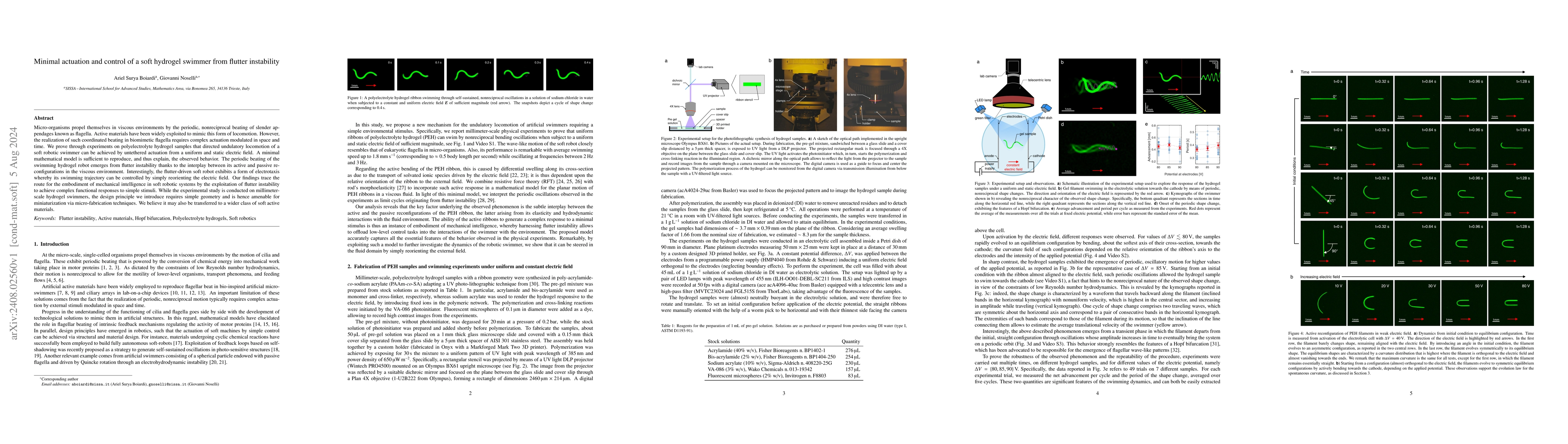 This research demonstrates how soft hydrogel swimmers can achieve directed undulatory locomotion through minimal actuation using a static electric field, driven by flutter instability. The periodic beating of the swimmer is controlled via electric field reorientation, paving the way for mechanical intelligence in soft robotics.