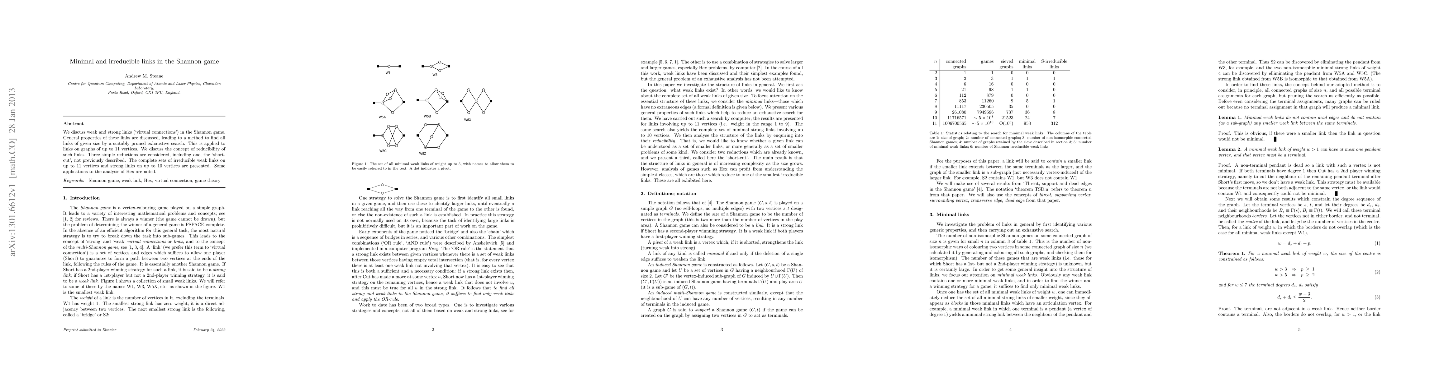 This paper explores weak and strong links in the Shannon game, presenting methods to identify all links of a given size through exhaustive search. It introduces the concept of link reducibility and presents complete sets of irreducible links for graphs up to 11 vertices, including a new 'short-cut' reduction. Applications to the analysis of the game Hex are also noted.
