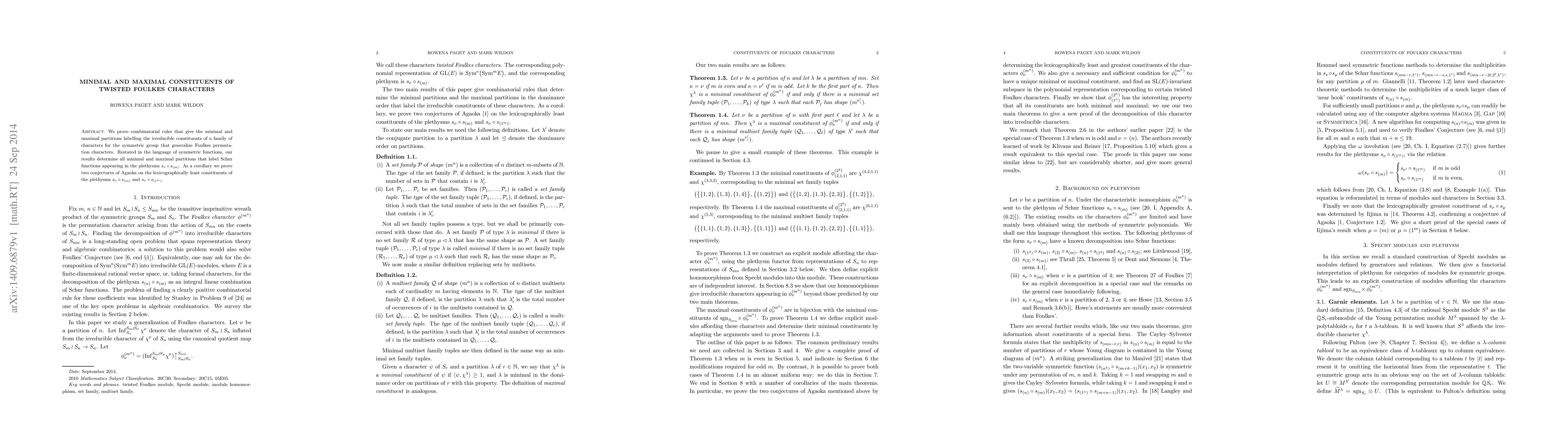 This paper provides combinatorial rules for identifying minimal and maximal partitions that label irreducible constituents of twisted Foulkes characters for the symmetric group. The results determine Schur functions appearing in plethysms, confirming Agaoka's conjectures on the lexicographically least constituents of specific plethysms.