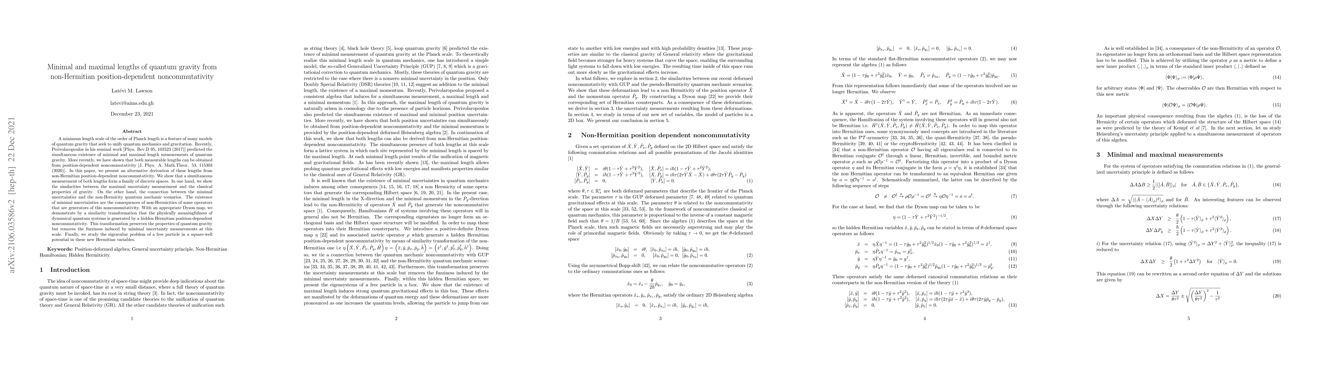 A minimum length scale of the order of Planck length is a feature of many models of quantum gravity that seek to unify quantum mechanics and gravitation. Recently, Perivolaropoulos in his seminal work [Phys. Rev.D 95, 103523 (2017)] predicted the simultaneous existence of minimal and maximal length measurements of quantum gravity. More recently, we have shown that both measurable lengths can be obtained from position-dependent noncommutativity [J. Phys. A: Math.Theor. 53, 115303 (2020)]. In this paper, we present an alternative derivation of these lengths from non-Hermitian position-dependent noncommutativity. We show that a simultaneous measurement of both lengths form a family of discrete spaces. In one hand, we show the similarities between the maximal uncertainty measurement and the classical properties of gravity. On the other hand, the connection between the minimal uncertainties and the non-Hermicity quantum mechanic scenarios. The existence of minimal uncertainties are the consequences of non-Hermicities of some operators that are generators of this noncommutativity. With an appropriate Dyson map, we demonstrate by a similarity transformation that the physically meaningfulness of dynamical quantum systems is generated by a hidden Hermitian position-dependent noncommutativity. This transformation preserves the properties of quantum gravity but removes the fuzziness induced by minimal uncertainty measurements at this scale. Finally, we study the eigenvalue problem of a free particle in a square-well potential in these new Hermitian variables.