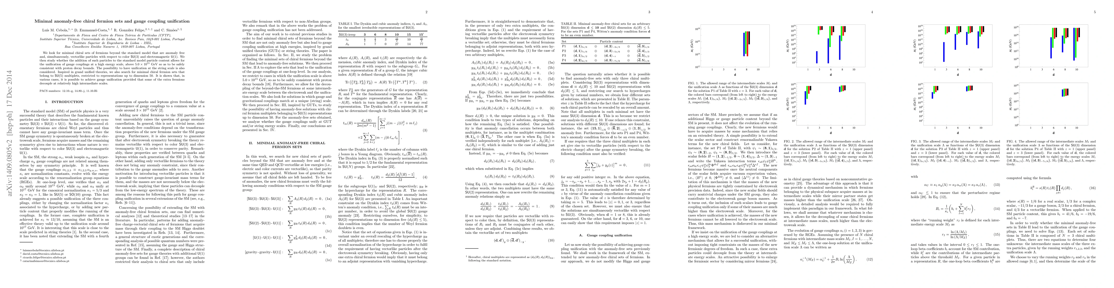 We look for minimal chiral sets of fermions beyond the standard model that are anomaly free and, simultaneously, vectorlike particles with respect to colour SU(3) and electromagnetic U(1). We then study whether the addition of such particles to the standard model particle content allows for the unification of gauge couplings at a high energy scale, above $5.0 \times 10^{15}$ GeV so as to be safely consistent with proton decay bounds. The possibility to have unification at the string scale is also considered. Inspired in grand unified theories, we also search for minimal chiral fermion sets that belong to SU(5) multiplets. Restricting to representations up to dimension 50, we show that some of these sets can lead to gauge unification at the GUT and/or string scales.