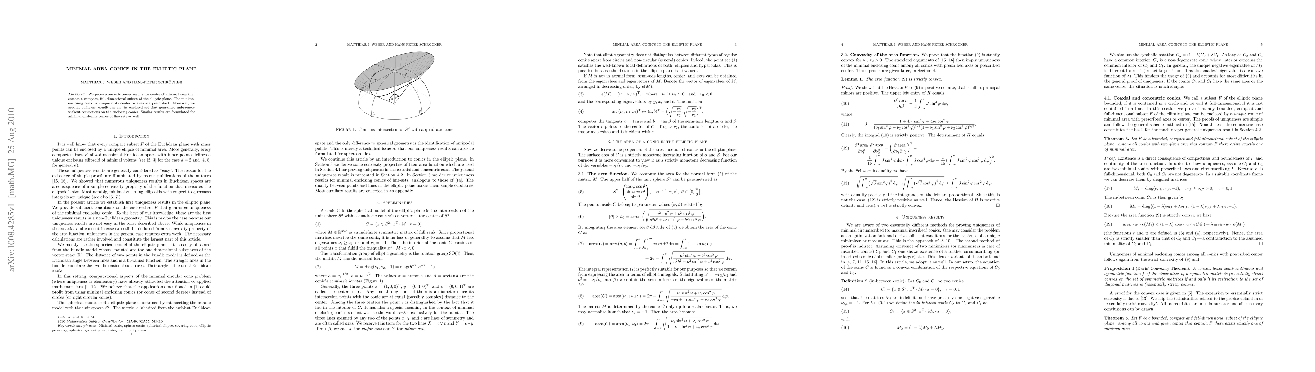 This paper proves uniqueness for minimal area conics in the elliptic plane that enclose a given compact set, showing that such conics are unique if their center or axes are specified. It also provides conditions ensuring uniqueness without restrictions on the conics, extending similar results to minimal enclosing conics of line sets.