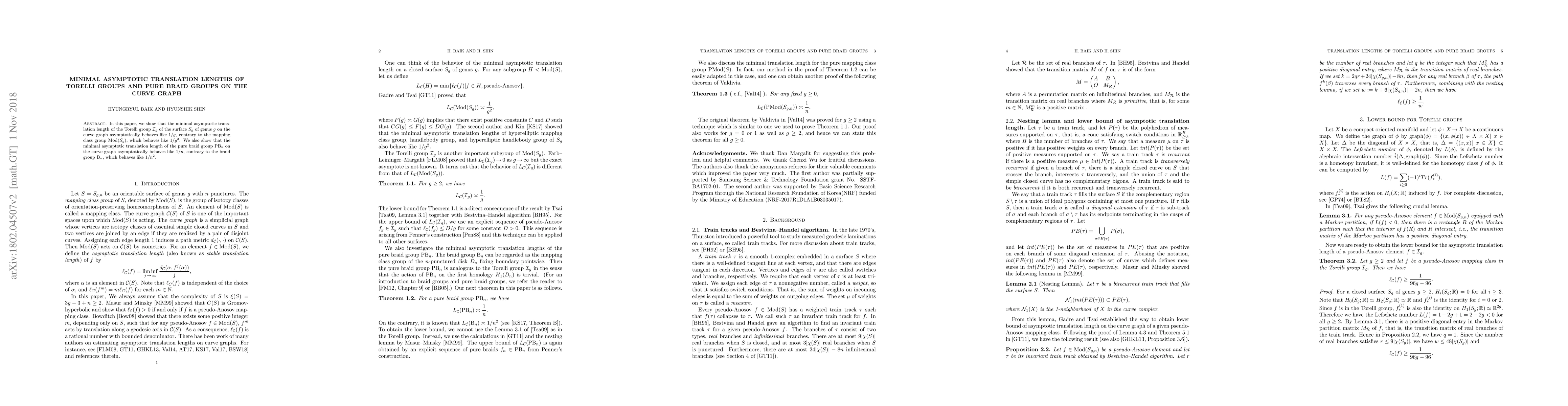 This paper demonstrates that the minimal asymptotic translation length of Torelli groups on the curve graph scales as $1/g$, contrasting with the $1/g^2$ scaling for mapping class groups. Additionally, it shows that the pure braid group's translation length scales as $1/n$, unlike the braid group's $1/n^2$ scaling.