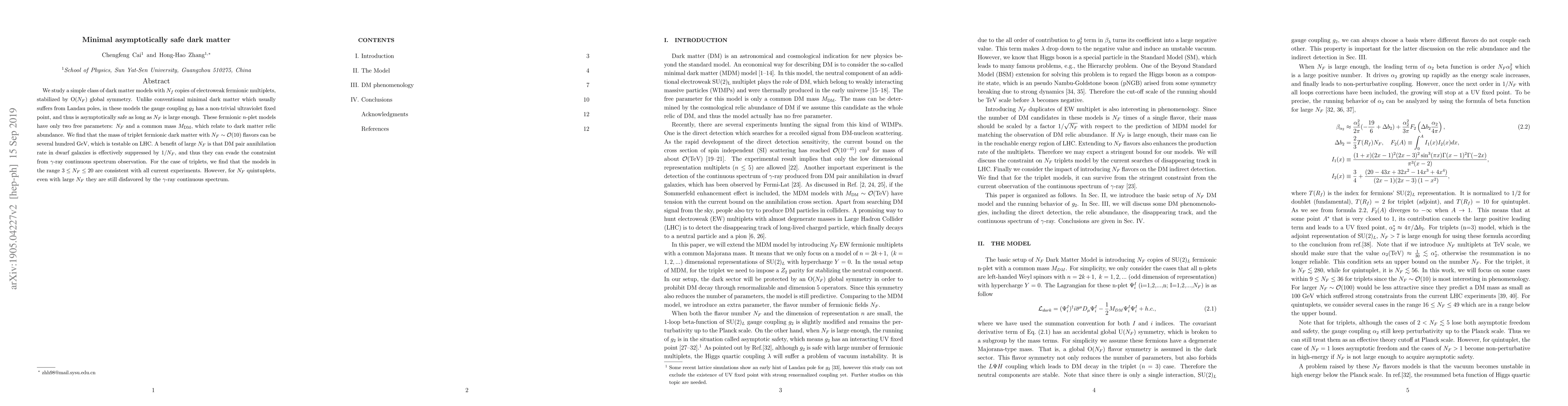 We study a simple class of dark matter models with N_f copies of electroweak fermionic multiplets, stabilized by O(N_F) global symmetry. Unlike conventional minimal dark matter which usually suffers from Landau poles, in these models the gauge coupling g_2 has a non-trivial ultraviolet fixed point, and thus is asymptotically safe as long as N_F is large enough. These fermionic n-plet models have only two free parameters: N_F and a common mass M_DM, which relate to dark matter relic abundance. We find that the mass of triplet fermionic dark matter with N_F being dozens of flavors can be several hundred GeV, which is testable on LHC. A benefit of large N_F is that DM pair annihilation rate in dwarf galaxies is effectively suppressed by 1/N_F, and thus they can evade the constraint from gamma-ray continuous spectrum observation. For the case of triplets, we find that the models in the range 3 <= N_F <= 20 are consistent with all current experiments. However, for N_F quintuplets, even with large N_F they are still disfavored by the gamma-ray continuous spectrum.