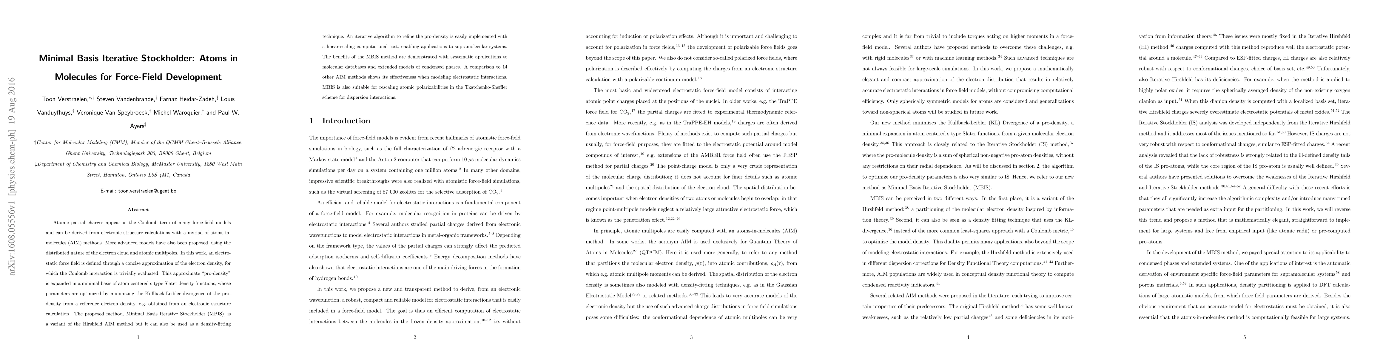 The Minimal Basis Iterative Stockholder (MBIS) method approximates electron density for electrostatic force fields using a minimal basis of s-type Slater functions, optimizing parameters to minimize the Kullback-Leibler divergence from reference densities. MBIS is effective for modeling electrostatic interactions and can scale linearly for large systems.