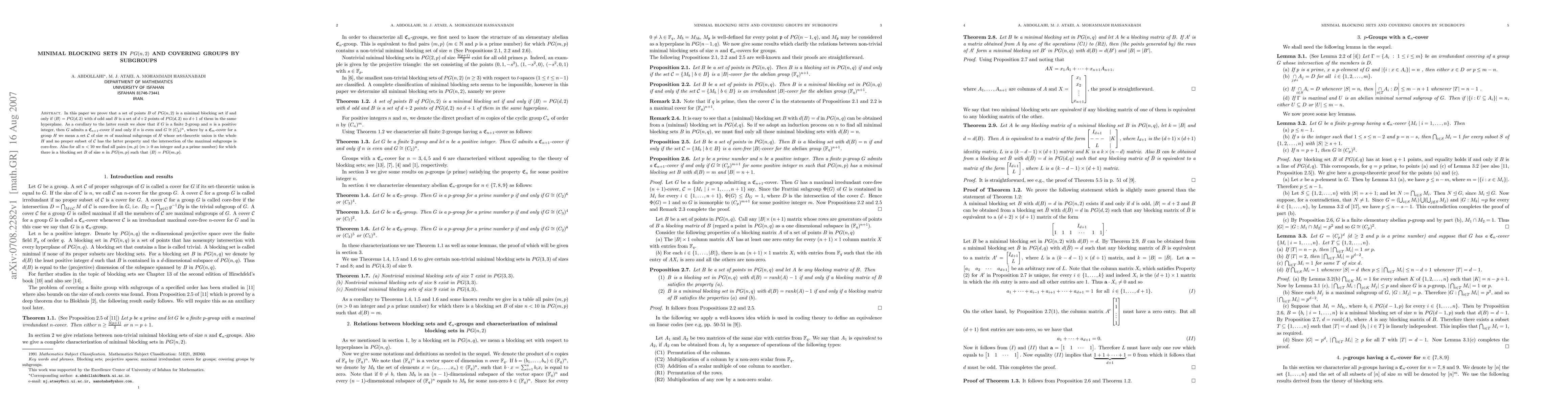 In this paper we prove that a set of points $B$ of PG(n,2) is a minimal blocking set if and only if $=PG(d,2)$ with $d$ odd and $B$ is a set of $d+2$ points of $PG(d,2)$ no $d+1$ of them in the same hyperplane. As a corollary to the latter result we show that if $G$ is a finite 2-group and $n$ is a positive integer, then $G$ admits a $\mathfrak{C}_{n+1}$-cover if and only if $n$ is even and $G\cong (C_2)^{n}$, where by a $\mathfrak{C}_m$-cover for a group $H$ we mean a set $\mathcal{C}$ of size $m$ of maximal subgroups of $H$ whose set-theoretic union is the whole $H$ and no proper subset of $\mathcal{C}$ has the latter property and the intersection of the maximal subgroups is core-free. Also for all $n<10$ we find all pairs $(m,p)$ ($m>0$ an integer and $p$ a prime number) for which there is a blocking set $B$ of size $n$ in $PG(m,p)$ such that $=PG(m,p)$.