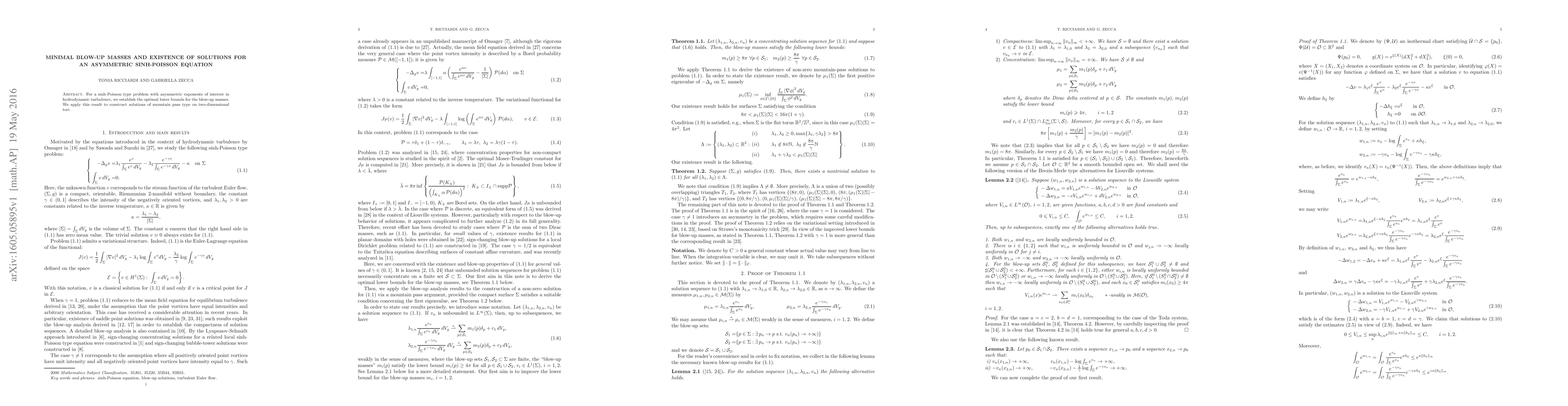 For a sinh-Poisson type problem with asymmetric exponents of interest in hydrodynamic turbulence, we establish the optimal lower bounds for the blow-up masses. We apply this result to construct solutions of mountain pass type on two-dimensional tori.