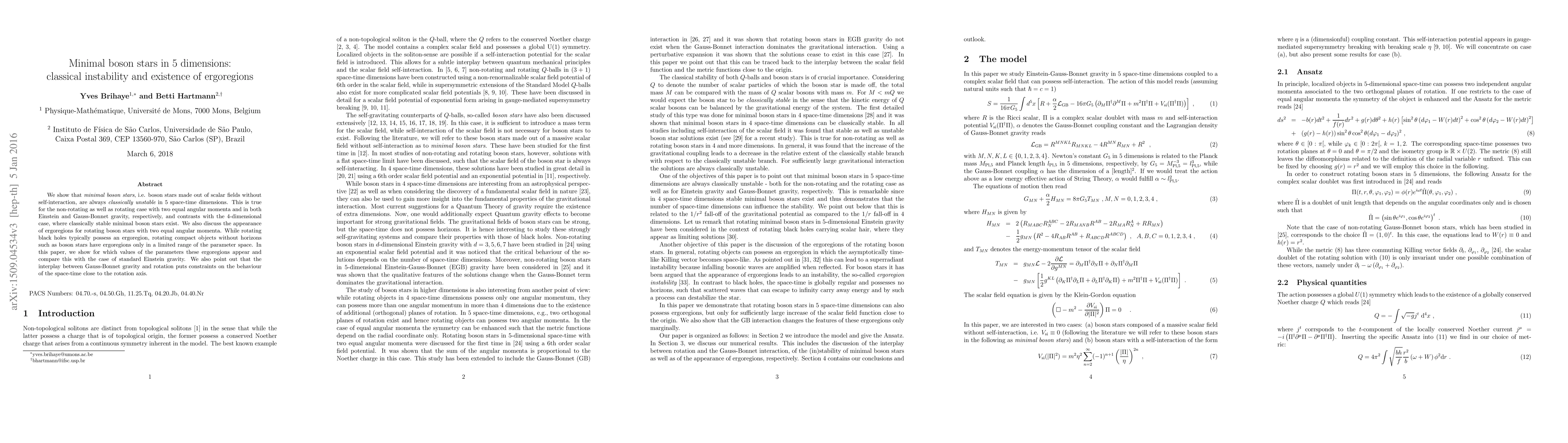 This paper demonstrates that minimal boson stars in 5 dimensions are classically unstable, contrasting with the stable configurations found in 4 dimensions. The study also reveals the conditions under which ergoregions emerge in rotating boson stars, highlighting the unique interplay between Gauss-Bonnet gravity and rotation.