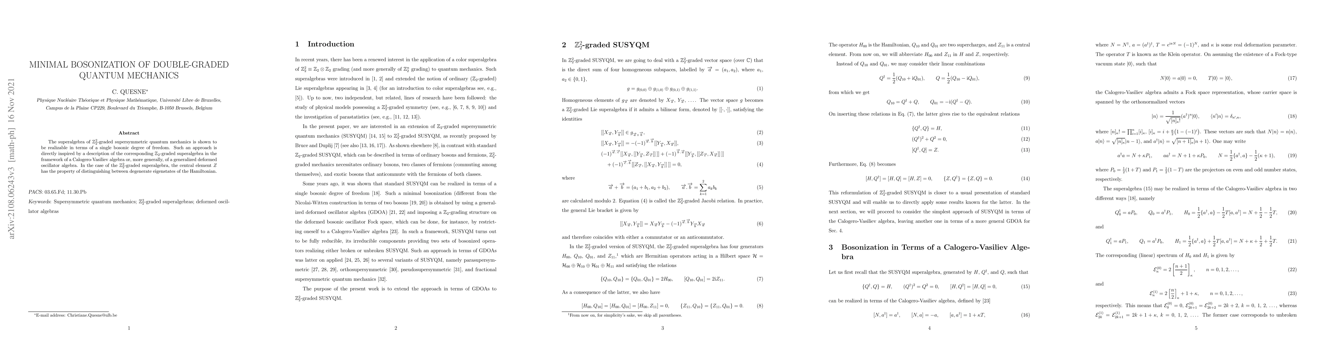 This paper demonstrates that the $\Z_2^2$-graded supersymmetric quantum mechanics can be bosonized using a single bosonic degree of freedom, inspired by the Calogero-Vasiliev algebra framework. The central element $Z$ distinguishes between degenerate eigenstates of the Hamiltonian.