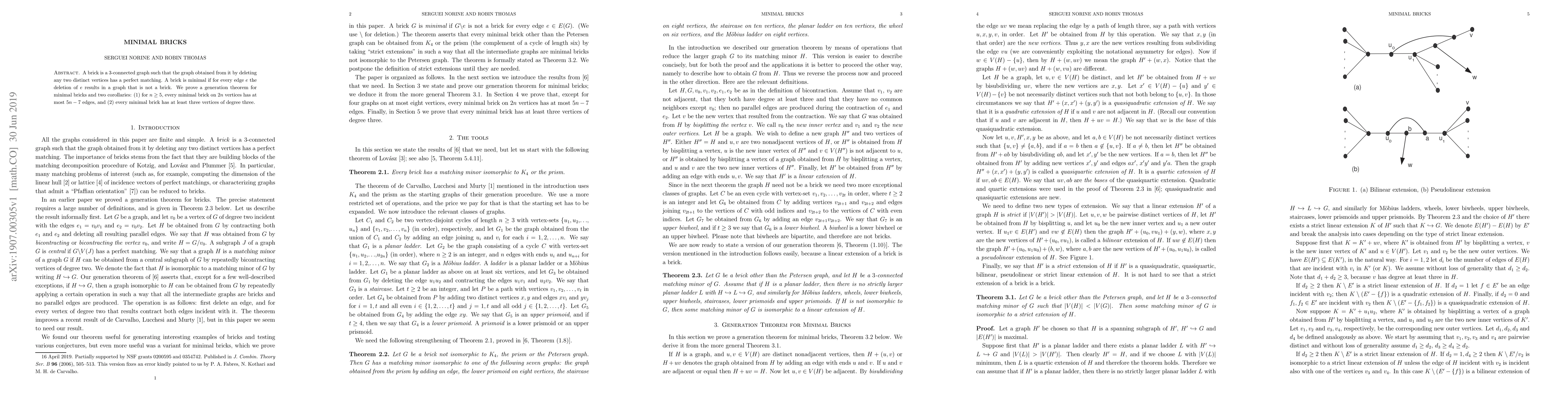 Researchers proved a generation theorem for minimal bricks, showing that every minimal brick has at most 5n-7 edges on 2n vertices, and every minimal brick has at least three vertices of degree three.